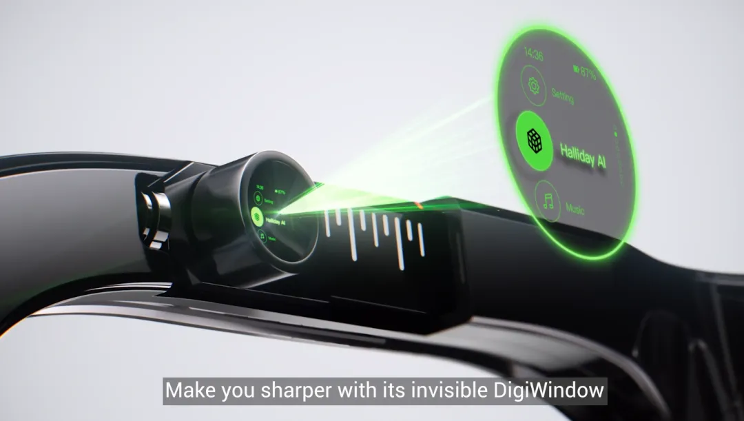 典型代表是仙瞬科技旗下的Halliday智能眼镜。和传统智能眼镜相比(是的智能眼镜都能用上“传统”这词儿了),Halliday最一目了然的创新之处,就是没有太“隆重”的设计,看起来和普通眼镜没什么差别,35克的重量在体感上也和普通眼镜没什么差别,但实际上别有洞天。