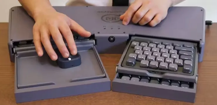 普通电脑的键盘和触控板2D分布,在这儿是3D分布。键盘分成左右两半,接在一个电机上,中间有一个摄像头会在你使用时观察手部动作:抬起右手掌,电机将右侧键盘拉回,露出下方触控;抬起左手掌,左侧键盘缩回,露出下方数字键盘;再抬手,缩进去的键盘又伸出来。